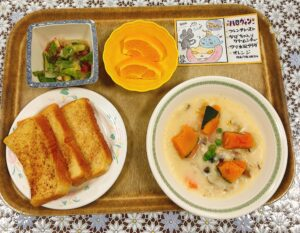 Menu yang disajikan adalah roti panggang ala Prancis (French toast), sup krim dengan labu, salad bergaya marinade, dan jeruk.