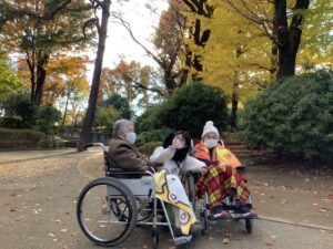 ショートステイご利用者様と秋の紅葉を見に行きました 2025年11月26日 最終更新日時 : 2025年11月19日 kagayaki ショートステイのご利用者様より「外を歩きたい」とのリクエストがあり、秋の晴れた日にしっかりと防寒対策を行って、歩いて7分ほどの公園へ紅葉を見に行きました。ちょうど見ごろのきれいな紅葉を楽しむことができました。