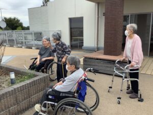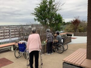 屋上へ行きました 2025年10月3日 最終更新日時 : 2025年10月14日 kagayaki 午後の時間に屋上へ遊びに行きました。 やや曇り空でしたが、久しぶりの外の空気に「気持ちが良いね~」「私の家はあっちかな?」とお話されていました。 「これはザクロの木ね」と植物のことを教えていただきました。
